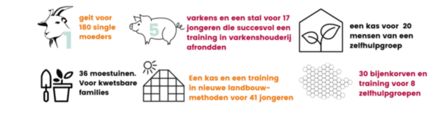 In Rwanda konden we zoals hierboven is te zien nog meer doen. Dankzij een dierbaar cadeau kregen 180 alleenstaande moeders een geit. Daarnaast konden we onder meer hulp bieden met een kas voor 20 deelnemers van een zelfhulpgroep, een stal met varkens voor jongeren die hiervoor ook een training volgden en 36 moestuinen voor kwetsbare gezinnen.