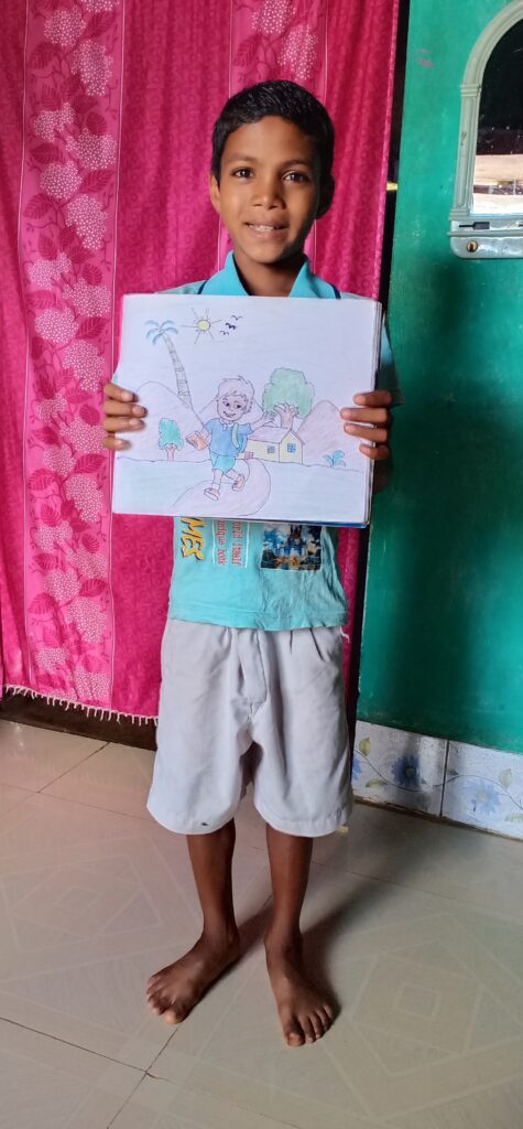 Amit begon met tekenen en hield niet meer op. Als we ernaar vragen vertelt hij: “Toen de school dicht was, wist ik niet wat ik moest doen. Ik mocht mijn vriendjes niet zien en daardoor werd ik steeds verdrietiger. Toen kreeg ik een kleurboek, potloden, gum en een puntenslijper. Kijk, dit is mijn kleurboek, ik heb heel veel kleurplaten gemaakt. Als er geen corona meer is, wil ik naar school en heel goed mijn best doen. Ik wil later leraar worden.”