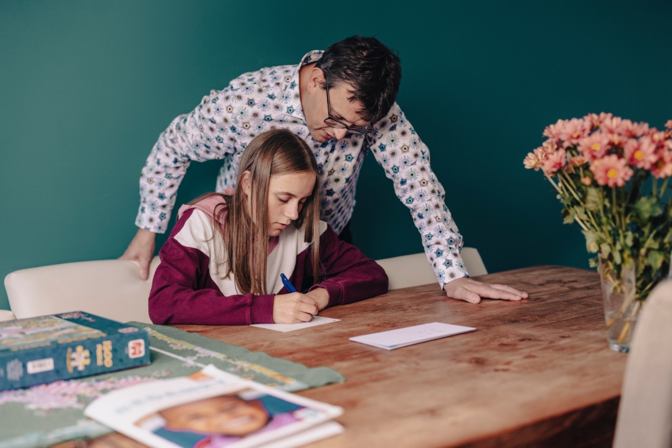 Ook op deze dag worden kaarten geschreven aan sponsorkind Susan. Met elkaar zitten ze gezellig aan de eettafel. Marinke heeft de spullen klaargelegd en Bram heeft voor lekkere koekjes en drankjes gezorgd. Juda en Susan kiezen allebei een kaart uit die ze mooi vinden.